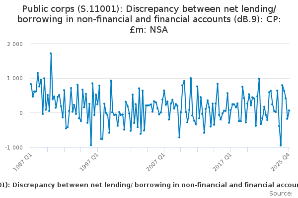 Download this time seriesPublic corps (S.11001): Discrepancy between net lending/ borrowing in non-financial and financial accounts (dB.9): CP: £m: NSA