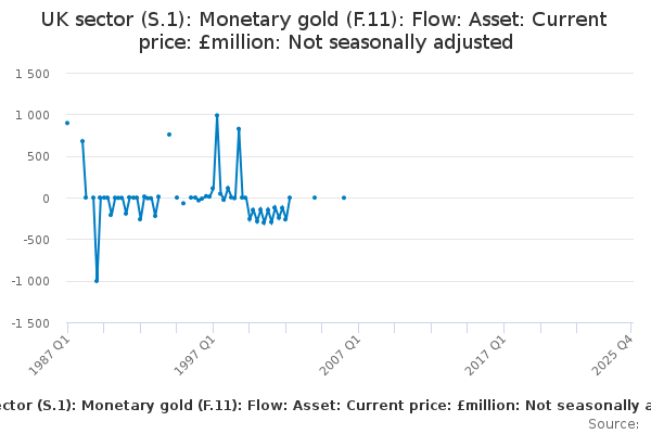 Download this time seriesUK sector (S.1): Monetary gold (F.11): Flow: Asset: Current price: £million: Not seasonally adjusted