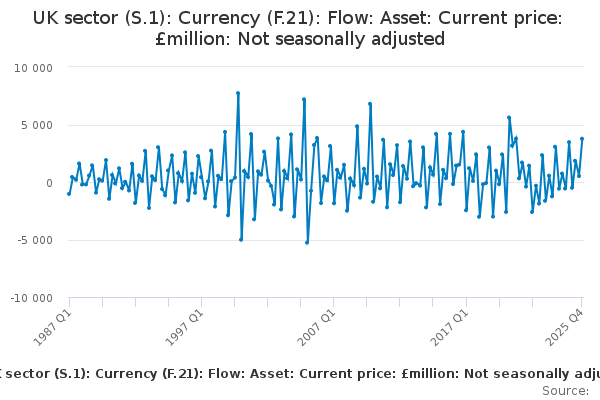 Download this time seriesUK sector (S.1): Currency (F.21): Flow: Asset: Current price: £million: Not seasonally adjusted