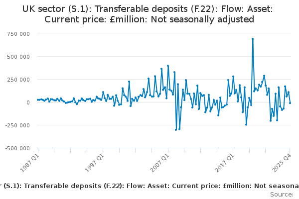 Download this time seriesUK sector (S.1): Transferable deposits (F.22): Flow: Asset: Current price: £million: Not seasonally adjusted