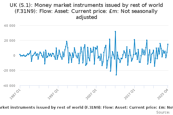Download this time seriesUK (S.1): Money market instruments issued by rest of world (F.31N9): Flow: Asset: Current price: £m: Not seasonally adjusted