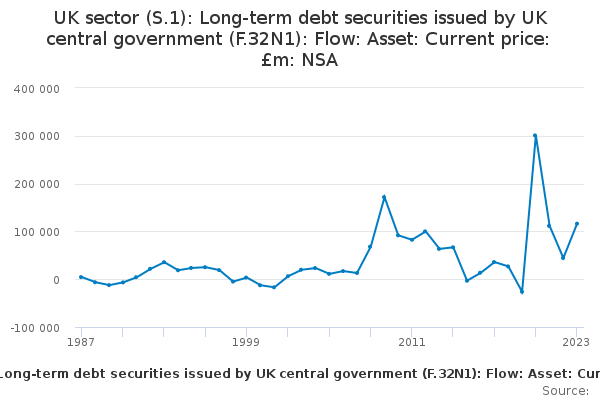 Download this time seriesUK sector (S.1): Long-term debt securities issued by UK central government (F.32N1): Flow: Asset: Current price: £m: NSA