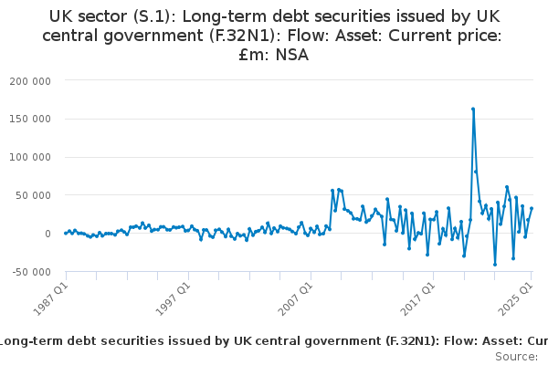 Download this time seriesUK sector (S.1): Long-term debt securities issued by UK central government (F.32N1): Flow: Asset: Current price: £m: NSA