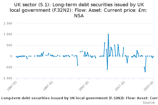 Download this time seriesUK sector (S.1): Long-term debt securities issued by UK local government (F.32N2): Flow: Asset: Current price: £m: NSA