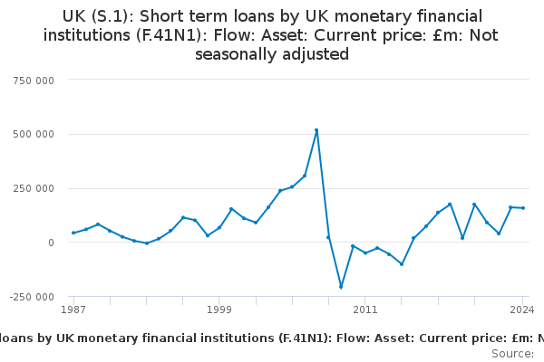 Download this time seriesUK (S.1): Short term loans by UK monetary financial institutions (F.41N1): Flow: Asset: Current price: £m: Not seasonally adjusted