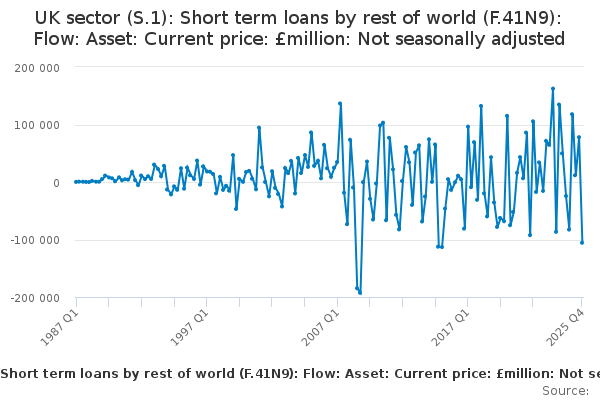 Download this time seriesUK sector (S.1): Short term loans by rest of world (F.41N9): Flow: Asset: Current price: £million: Not seasonally adjusted