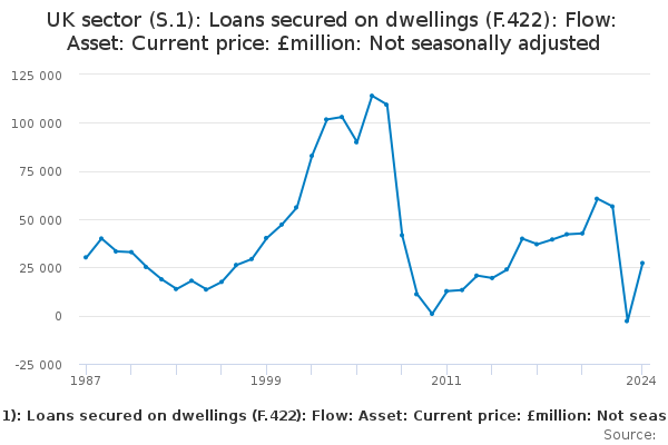 Download this time seriesUK sector (S.1): Loans secured on dwellings (F.422): Flow: Asset: Current price: £million: Not seasonally adjusted
