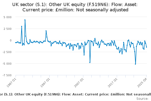 Download this time seriesUK sector (S.1): Other UK equity (F.519N6): Flow: Asset: Current price: £million: Not seasonally adjusted