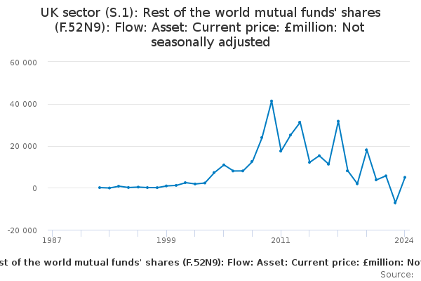 Download this time seriesUK sector (S.1): Rest of the world mutual funds' shares (F.52N9): Flow: Asset: Current price: £million: Not seasonally adjusted