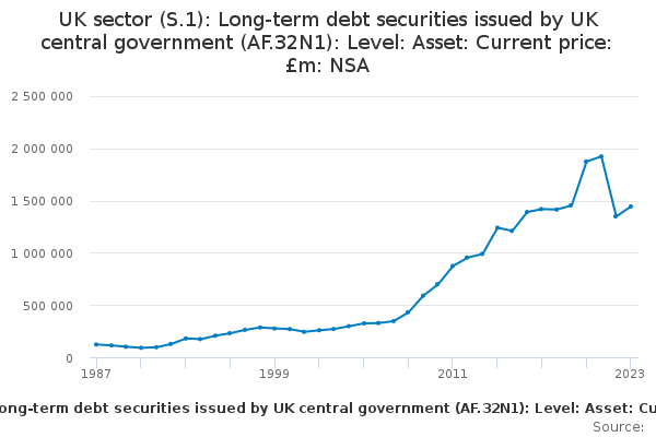 Download this time seriesUK sector (S.1): Long-term debt securities issued by UK central government (AF.32N1): Level: Asset: Current price: £m: NSA