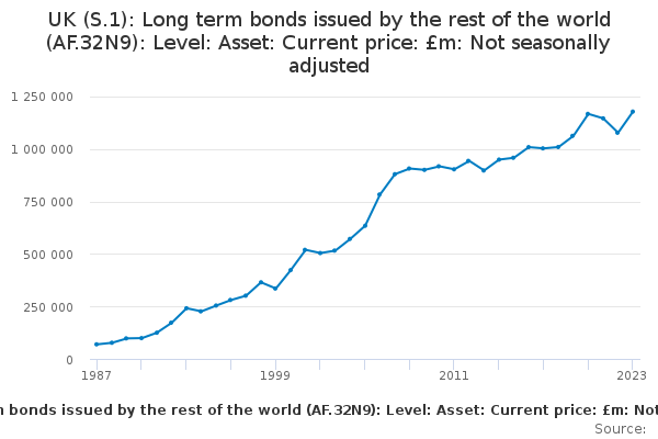 Download this time seriesUK (S.1): Long term bonds issued by the rest of the world (AF.32N9): Level: Asset: Current price: £m: Not seasonally adjusted