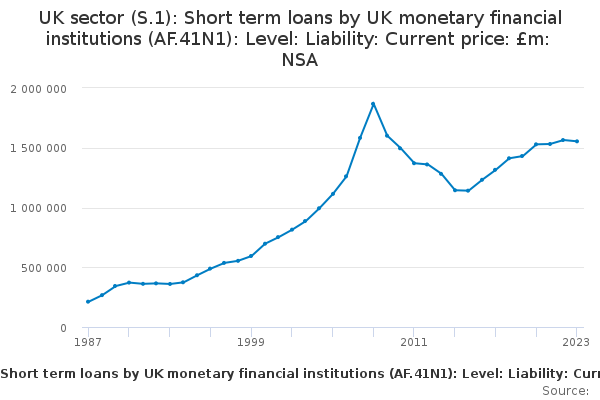 Download this time seriesUK sector (S.1): Short term loans by UK monetary financial institutions (AF.41N1): Level: Liability: Current price: £m: NSA