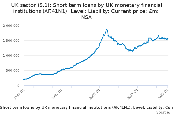 Download this time seriesUK sector (S.1): Short term loans by UK monetary financial institutions (AF.41N1): Level: Liability: Current price: £m: NSA