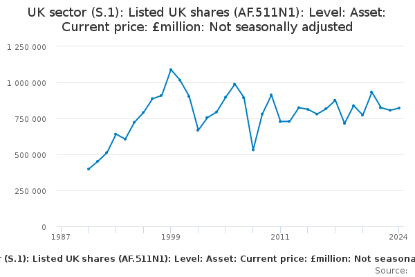 Download this time seriesUK sector (S.1): Listed UK shares (AF.511N1): Level: Asset: Current price: £million: Not seasonally adjusted