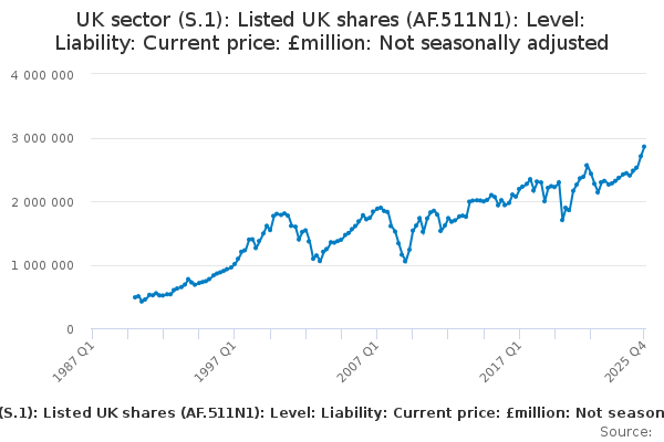 Download this time seriesUK sector (S.1): Listed UK shares (AF.511N1): Level: Liability: Current price: £million: Not seasonally adjusted