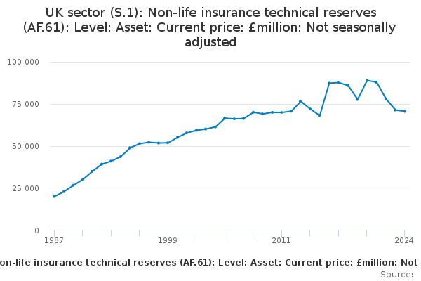 Download this time seriesUK sector (S.1): Non-life insurance technical reserves (AF.61): Level: Asset: Current price: £million: Not seasonally adjusted