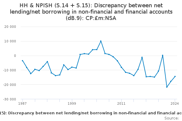 Download this time seriesHH & NPISH (S.14 + S.15): Discrepancy between net lending/net borrowing in non-financial and financial accounts (dB.9): CP:£m:NSA
