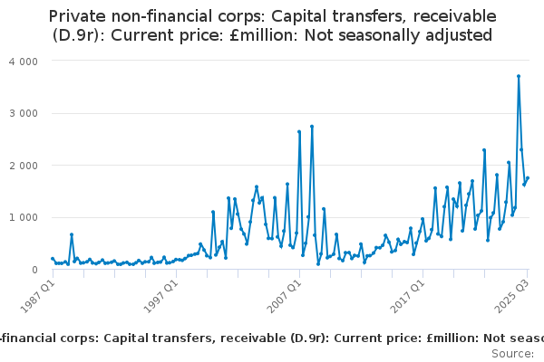 Download this time seriesPrivate non-financial corps: Capital transfers, receivable (D.9r): Current price: £million: Not seasonally adjusted