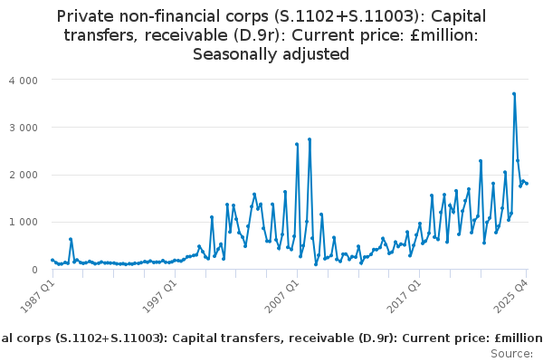 Download this time seriesPrivate non-financial corps (S.1102+S.11003): Capital transfers, receivable (D.9r): Current price: £million: Seasonally adjusted