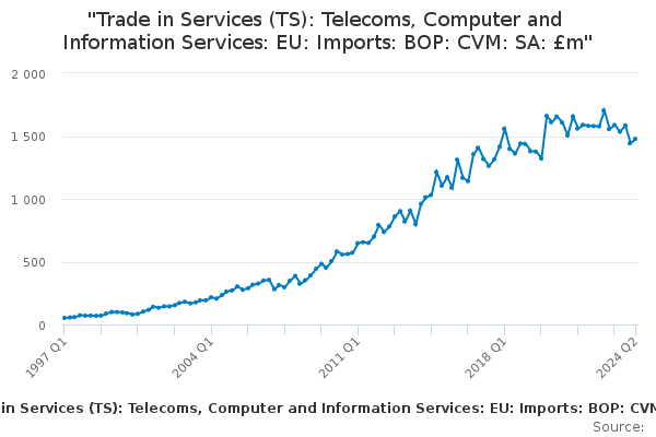 Download this time series"Trade in Services (TS): Telecoms, Computer and Information Services: EU: Imports: BOP: CVM: SA: £m"