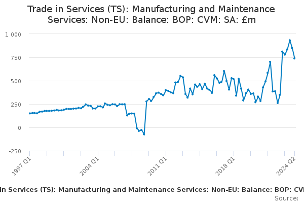 Download this time seriesTrade in Services (TS): Manufacturing and Maintenance Services: Non-EU: Balance: BOP: CVM: SA: £m