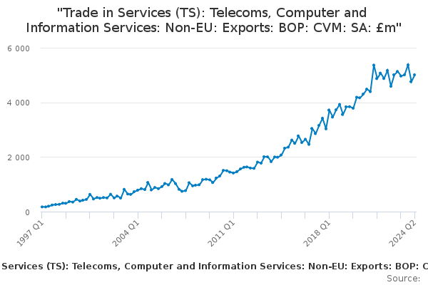 Download this time series"Trade in Services (TS): Telecoms, Computer and Information Services: Non-EU: Exports: BOP: CVM: SA: £m"