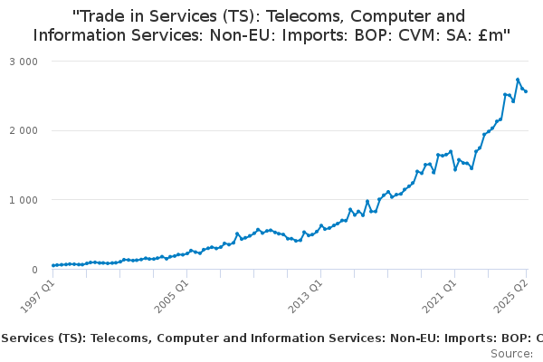 Download this time series"Trade in Services (TS): Telecoms, Computer and Information Services: Non-EU: Imports: BOP: CVM: SA: £m"