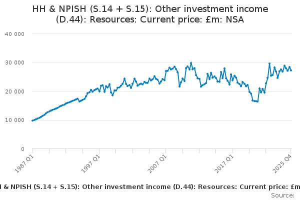Download this time seriesHH & NPISH (S.14 + S.15): Other investment income (D.44): Resources: Current price: £m: NSA