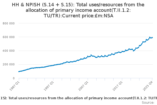 Download this time seriesHH & NPISH (S.14 + S.15): Total uses/resources from the allocation of primary income account(T.II.1.2: TU/TR):Current price:£m:NSA