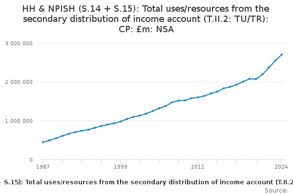 Download this time seriesHH & NPISH (S.14 + S.15): Total uses/resources from the secondary distribution of income account (T.II.2: TU/TR): CP: £m: NSA