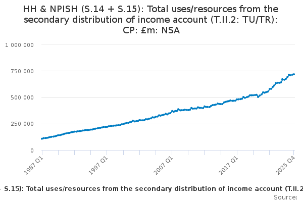 Download this time seriesHH & NPISH (S.14 + S.15): Total uses/resources from the secondary distribution of income account (T.II.2: TU/TR): CP: £m: NSA