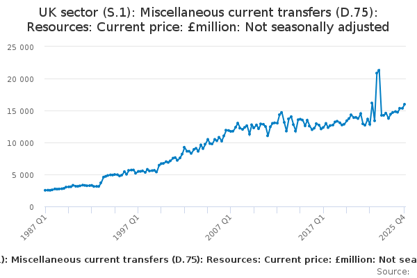 Download this time seriesUK sector (S.1): Miscellaneous current transfers (D.75): Resources: Current price: £million: Not seasonally adjusted