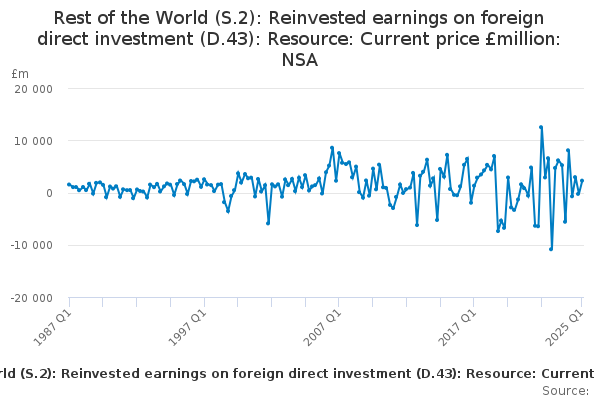 Download this time seriesRest of the World (S.2): Reinvested earnings on foreign direct investment (D.43): Resource: Current price £million: NSA