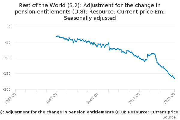 Download this time seriesRest of the World (S.2): Adjustment for the change in pension entitlements (D.8): Resource: Current price £m: Seasonally adjusted