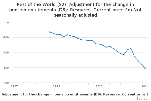 Download this time seriesRest of the World (S2): Adjustment for the change in pension entitlements (D8): Resource: Current price £m Not seasonally adjusted
