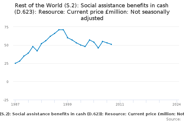 Download this time seriesRest of the World (S.2): Social assistance benefits in cash (D.623): Resource: Current price £million: Not seasonally adjusted