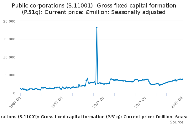 Download this time seriesPublic corporations (S.11001): Gross fixed capital formation (P.51g): Current price: £million: Seasonally adjusted