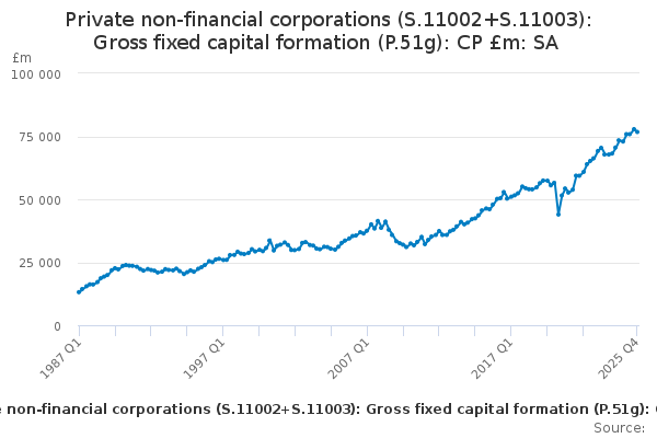 Download this time seriesPrivate non-financial corporations (S.11002+S.11003): Gross fixed capital formation (P.51g): CP £m: SA