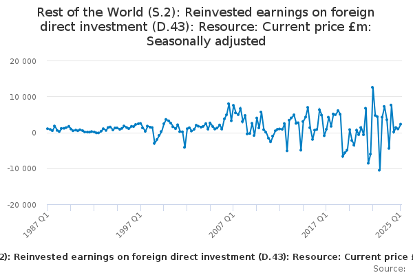 Download this time seriesRest of the World (S.2): Reinvested earnings on foreign direct investment (D.43): Resource: Current price £m: Seasonally adjusted