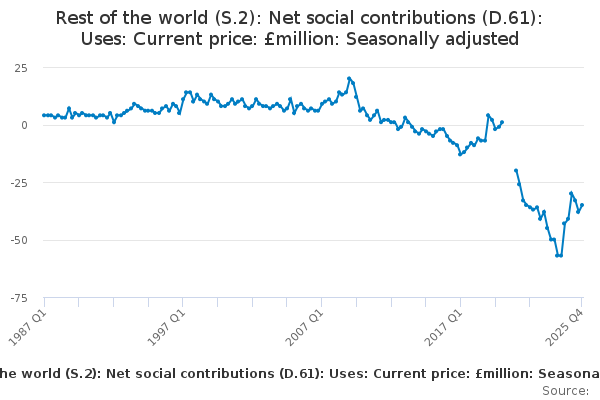 Download this time seriesRest of the world (S.2): Net social contributions (D.61): Uses: Current price: £million: Seasonally adjusted