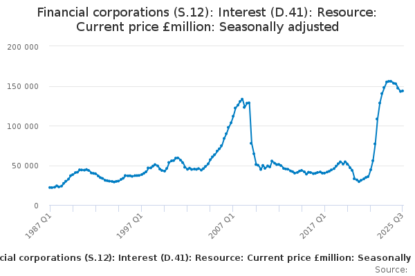 Download this time seriesFinancial corporations (S.12): Interest (D.41): Resource: Current price £million: Seasonally adjusted
