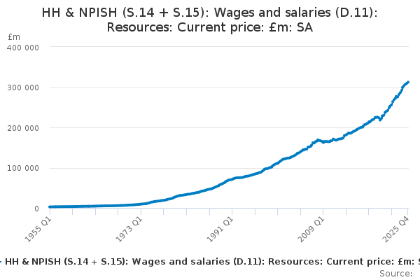 Download this time seriesHH & NPISH (S.14 + S.15): Wages and salaries (D.11): Resources: Current price: £m: SA