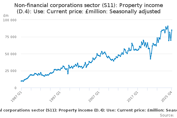 Download this time seriesNon-financial corporations sector (S11): Property income (D.4): Use: Current price: £million: Seasonally adjusted