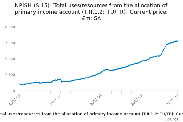 Download this time seriesNPISH (S.15): Total uses/resources from the allocation of primary income account (T.II.1.2: TU/TR): Current price: £m: SA