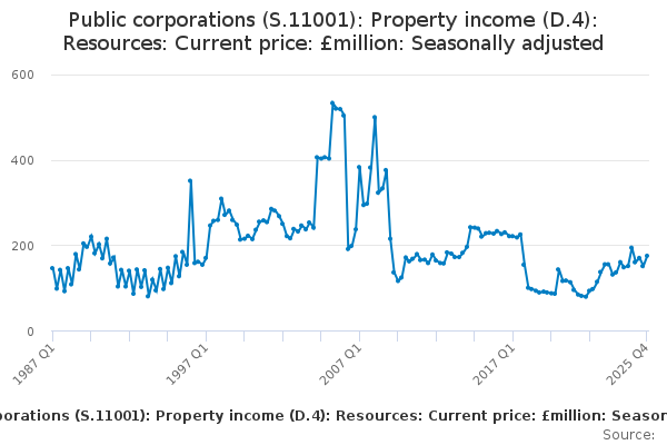Download this time seriesPublic corporations (S.11001): Property income (D.4): Resources: Current price: £million: Seasonally adjusted