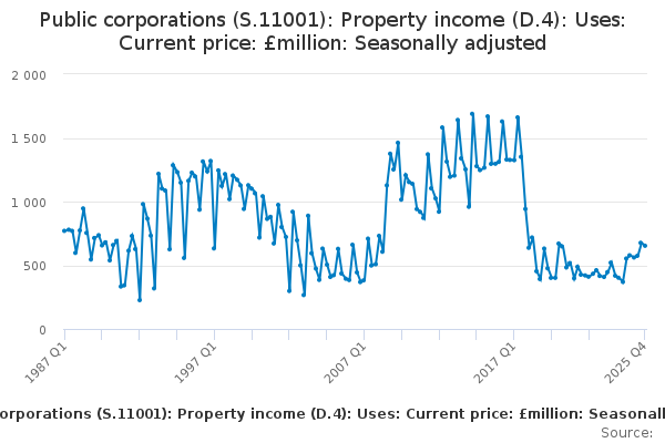 Download this time seriesPublic corporations (S.11001): Property income (D.4): Uses: Current price: £million: Seasonally adjusted