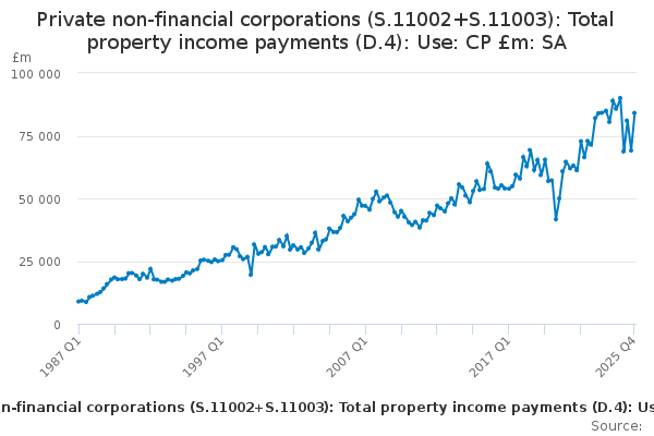 Download this time seriesPrivate non-financial corporations (S.11002+S.11003): Total property income payments (D.4): Use: CP £m: SA