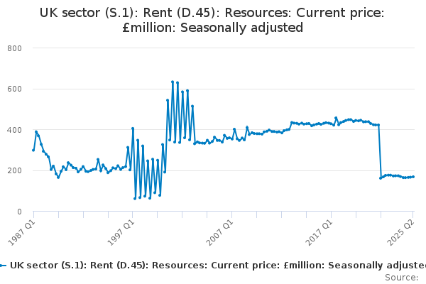 Download this time seriesUK sector (S.1): Rent (D.45): Resources: Current price: £million: Seasonally adjusted