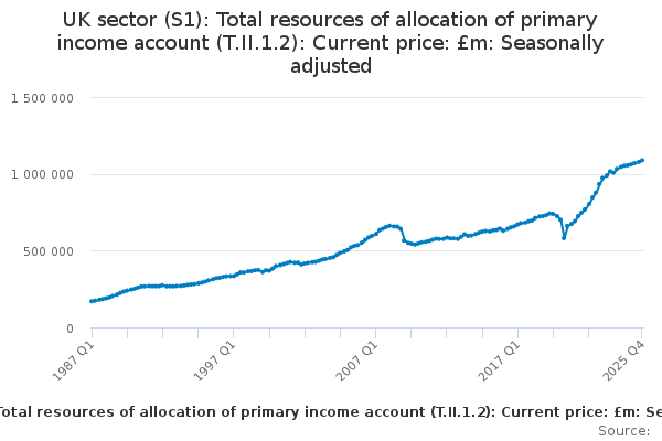 Download this time seriesUK sector (S1): Total resources of allocation of primary income account (T.II.1.2): Current price: £m: Seasonally adjusted