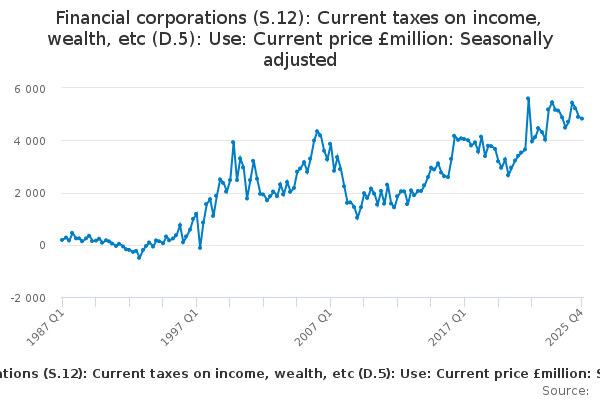 Download this time seriesFinancial corporations (S.12): Current taxes on income, wealth, etc (D.5): Use: Current price £million: Seasonally adjusted